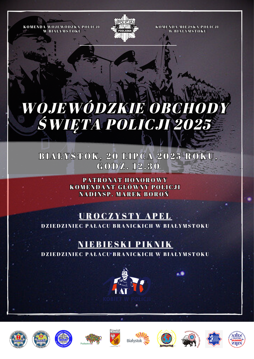 20 lipca, na Dziedzińcu Pałacu Branickich w Białymstoku, odbędą się tegoroczne Wojewódzkie Obchody Święta Policji. Uroczystość swoim honorowym patronatem objął Komendant Główny Policji nadinspektor Marek Boroń. Podczas obchodów zorganizowany będzie również "Niebieski piknik", na którym można będzie odwiedzić m.in. tematyczne stoiska profilaktyczne dotyczące bezpieczeństwa, w tym podczas wakacji. Będzie można zobaczyć także pokaz psów policyjnych oraz sprzęt policyjny.