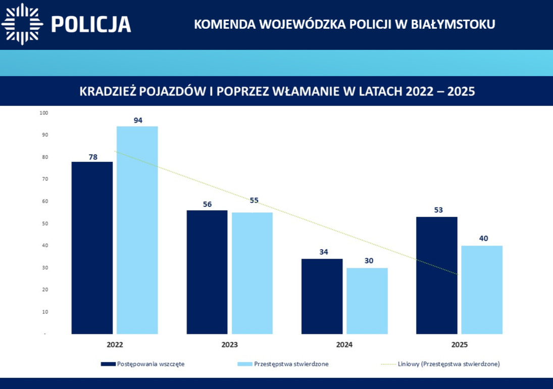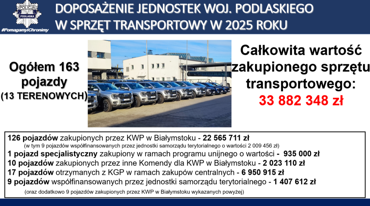 Łączna kwota zakupu 163 samochodów, które trafiły w 2025 roku do podlaskich policjantów wynosiła blisko 34 miliony złotych. Tabor ten zasili poszczególne jednostki garnizonu podlaskiego. Pojazdy te zostały zakupione ze środków budżetowych. Część nich przy wsparciu samorządów, które przeznaczyły na ten cel ponad 2 000 000 złotych. Są to radiowozy oznakowane i nieoznakowane, w tym również ciężarowe oraz rowery, w tym ze wspomaganiem elektrycznym.