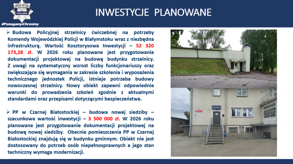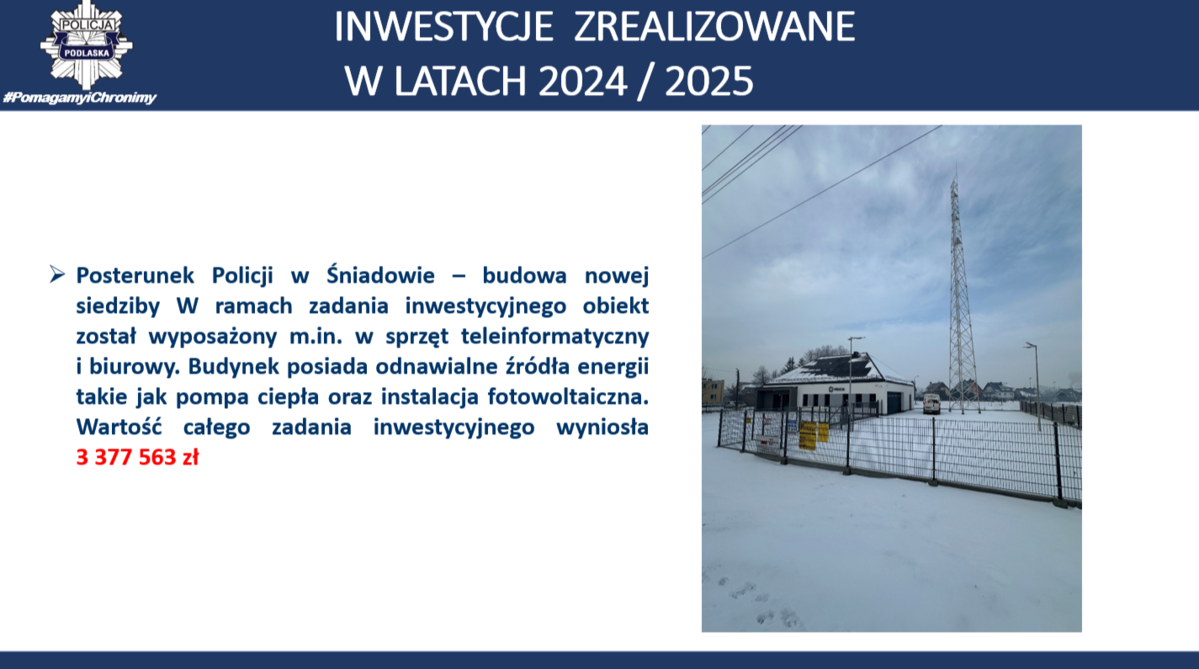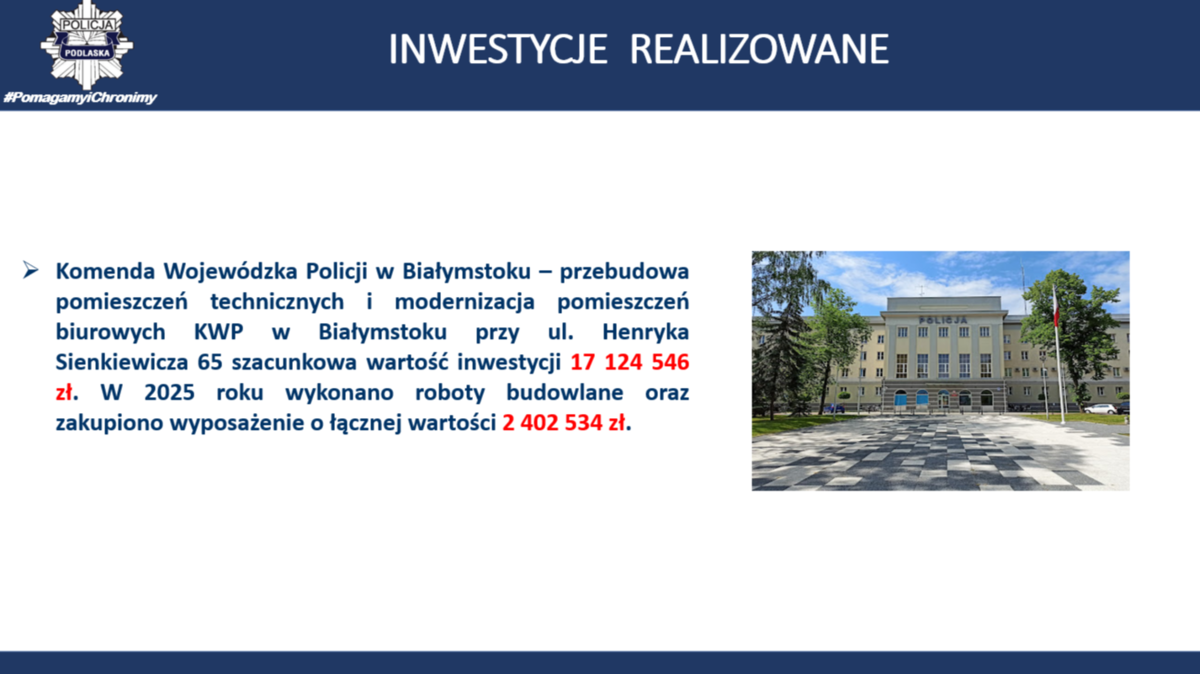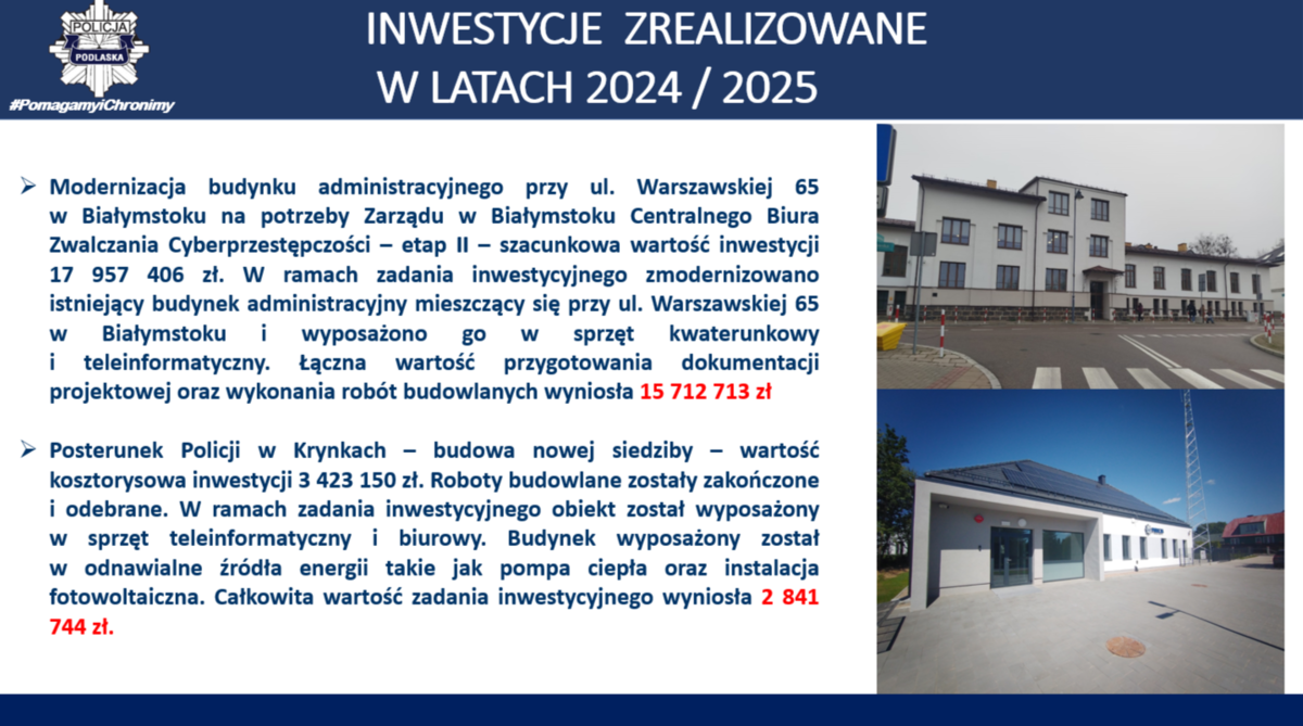 W Komendzie Wojewódzkiej Policji w Białymstoku – przebudowywane są pomieszczenia techniczne i modernizacja pomieszczeń biurowych KWP w Białymstoku przy ul. Henryka Sienkiewicza 65 – III etap – szacunkowa wartość inwestycji 17 124 546 zł (okres realizacji 2022-2026). W ramach zadania modernizowane są pomieszczenia biurowe i techniczne. Na każdym piętrze budynku zostaną utworzone pomieszczenia socjalne. Część pomieszczeń zostanie wyposażona w urządzenia klimatyzacyjne. Zostaną wymienione instalacje elektryczne, oświetleniowe i teletechniczne. Wszystkie remontowane pomieszczenia zostaną wyposażone w nowy sprzęt kwaterunkowy. Posterunek Policji w Krynkach – budowa nowej siedziby – wartość kosztorysowa inwestycji 3 423 150 zł (okres realizacji 2022-2025). Budynek został wyposażony w instalację fotowoltaiczną, instalację klimatyzacyjną oraz wentylację mechaniczną. Ogrzewany jest przy pomocy powietrznej pompy ciepła. Na działce powstał również maszt antenowy o wysokości 30 metrów. Posterunek Policji w Śniadowie – budowa nowej siedziby – wartość kosztorysowa inwestycji 3 419 548 zł (okres realizacji 2022-2025). Budynek został wyposażony w instalację fotowoltaiczną, instalację klimatyzacyjną oraz wentylację mechaniczną. Budynek ogrzewany jest przy pomocy powietrznej pompy ciepła. Na działce przy budynku powstał również maszt antenowy o wysokości 30 metrów.