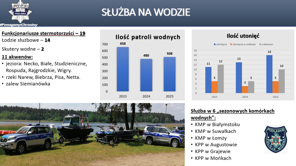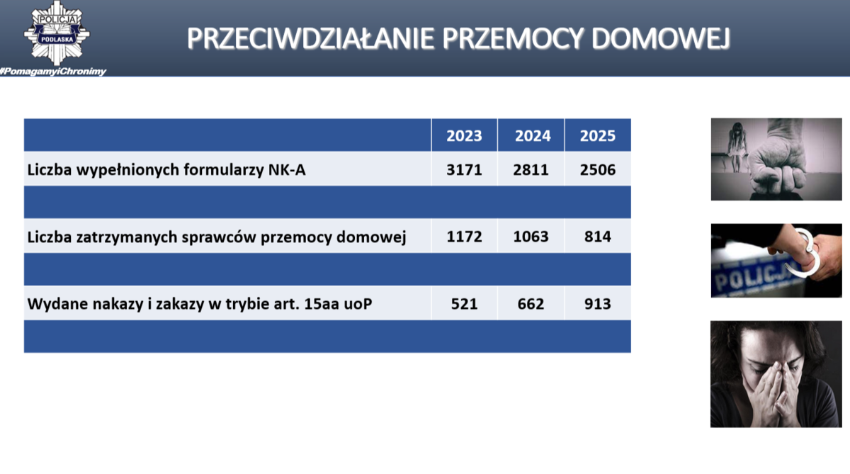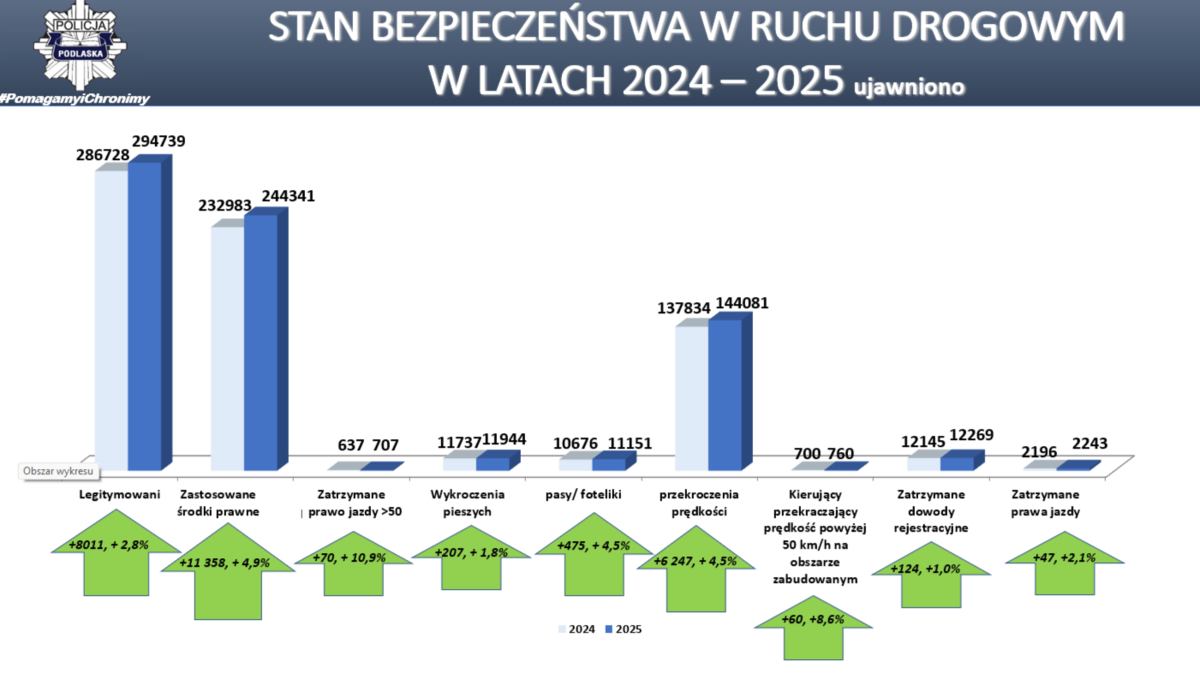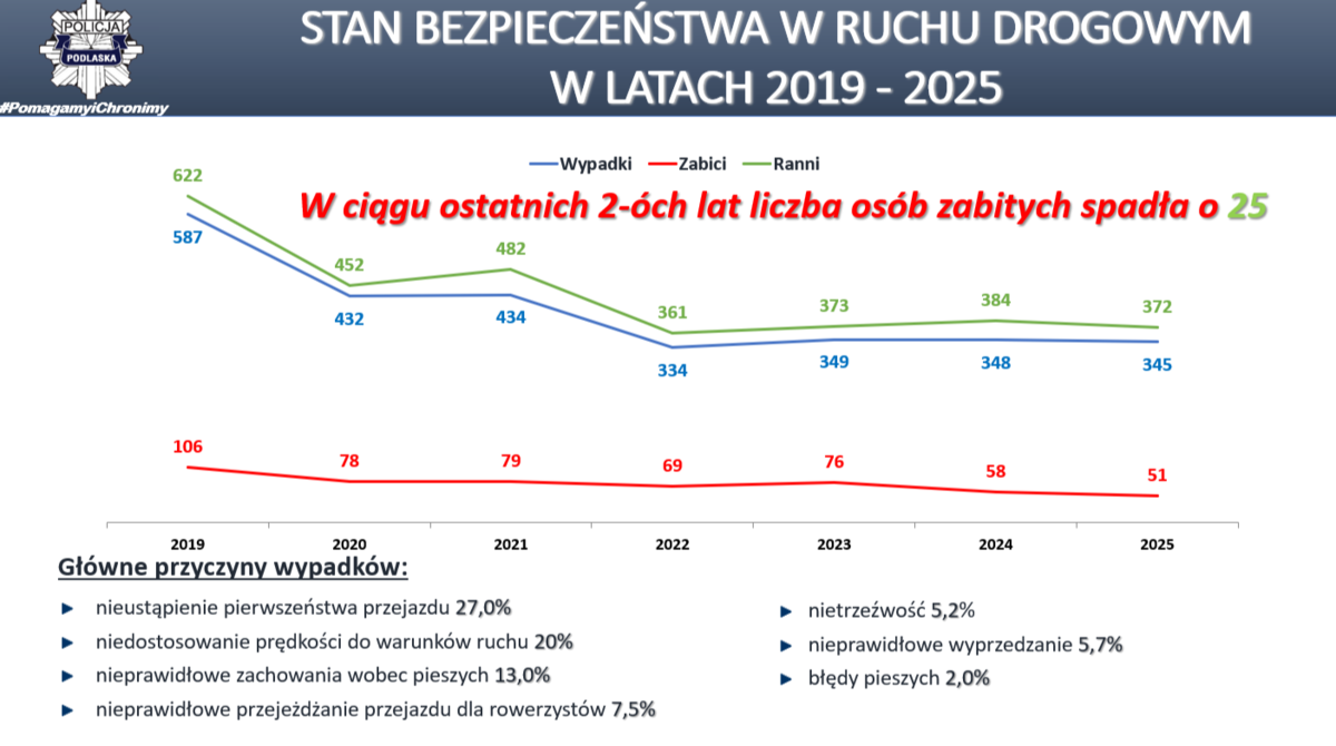 W naszym województwie liczba ofiar śmiertelnych wypadków drogowych, była najmniejsza w skali kraju. Na drogach województwa podlaskiego zaistniało 345 wypadków drogowych (w 2024 roku – 348 wypadków), w których śmierć poniosło 51 osób (w 2024 roku 58 zabitych), ranne zostały 372 osóby (w 2024 roku 384 rannych). Odnotowano spadek liczby wypadków o 3, spadek liczby zabitych o 7, spadek liczby rannych o 12. Główną przyczyną wypadków w 2025 r. było nieustąpienie pierwszeństwa przejazdu – 93 wypadki co stanowi 27% ogółu. Drugą w kolejności przyczyną była nadmierna prędkość i niedostosowanie jej do warunków ruchu – 69 wypadki, tj. 20% ogółu). Nietrzeźwi uczestnicy ruchu drogowego spowodowali 18 wypadków (kierowcy - 18, piesi - 1), w 2024 roku – 28 wypadków. W 2025 roku podlascy policjanci wyeliminowali z ruchu 1 780 kierujących będących pod wpływem alkoholu (w 2024 r. – 1 751) mogących doprowadzić do tragicznych w skutkach zdarzeń drogowych.