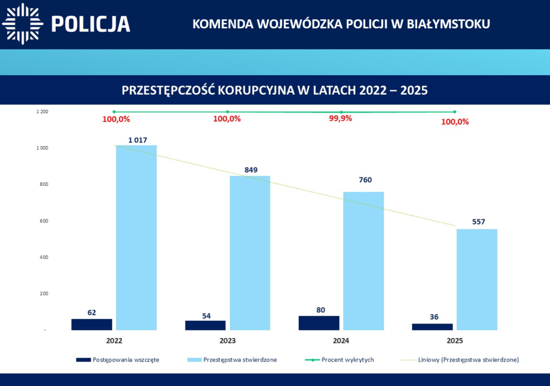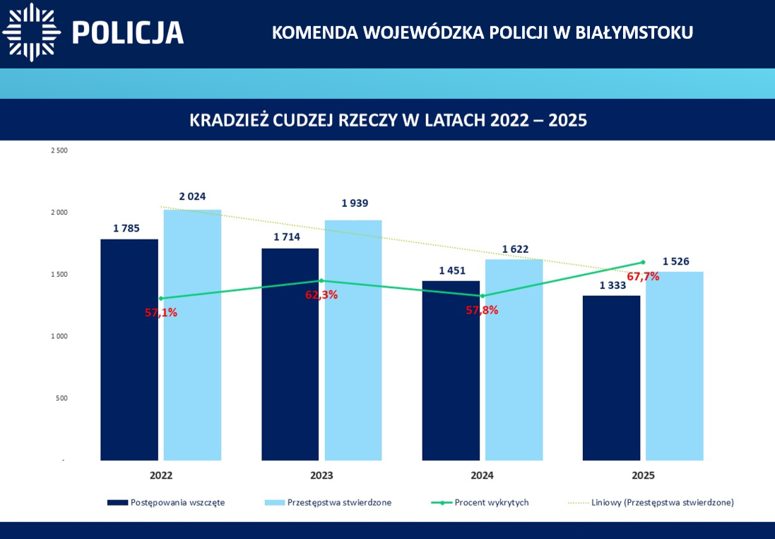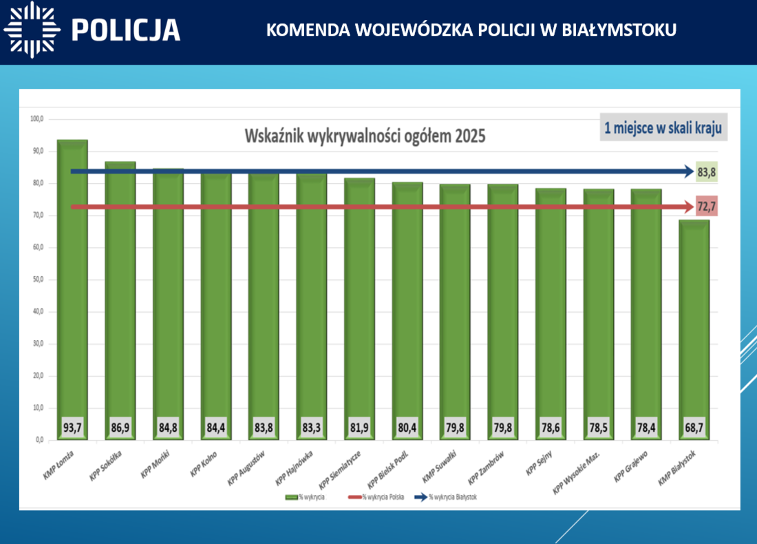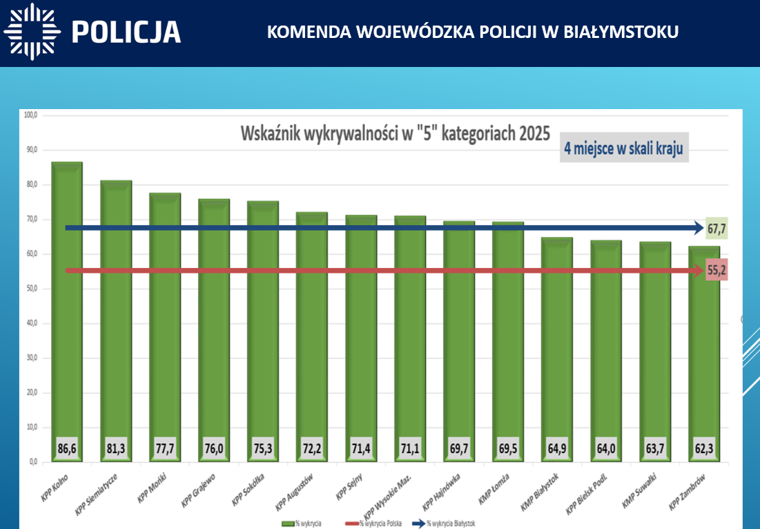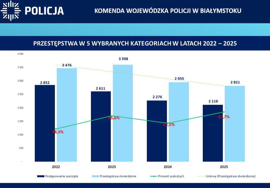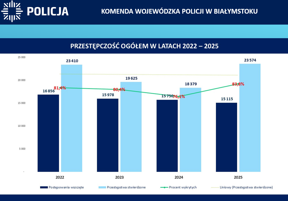 W 2025 roku, na terenie województwa podlaskiego wskaźnik wykrywalności ogółem wyniósł 83,8% i zapewnił garnizonowi podlaskiemu I miejsce w kraju. W kategorii 5 przestępstw najbardziej uciążliwych społecznie wyniósł 67,7 %, a policjanci odnotowali 2821 przestępstw w tych kategoriach (o 134 mniej). Nastąpił spadek przestępstw w takich kategoriach jak kradzież o 96 czynów (1622 w 2024r. na 1526 w 2025r.) czy kradzież z włamaniem o 55 czynów (1123 w roku 2024) . O 31 spadła także liczba rozbojów, kradzieży rozbójniczych i wymuszeń (129 w 2024r.). W 2025 roku nastąpił również spadek w przestępczości korupcyjnej. Funkcjonariusze na terenie województwa odnotowali 557 takich przestępstw i jest to spadek 203 czyny.