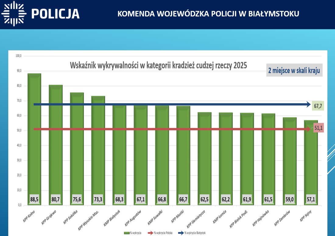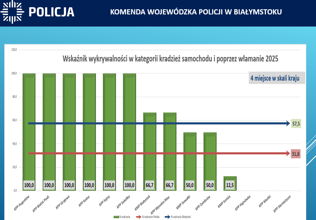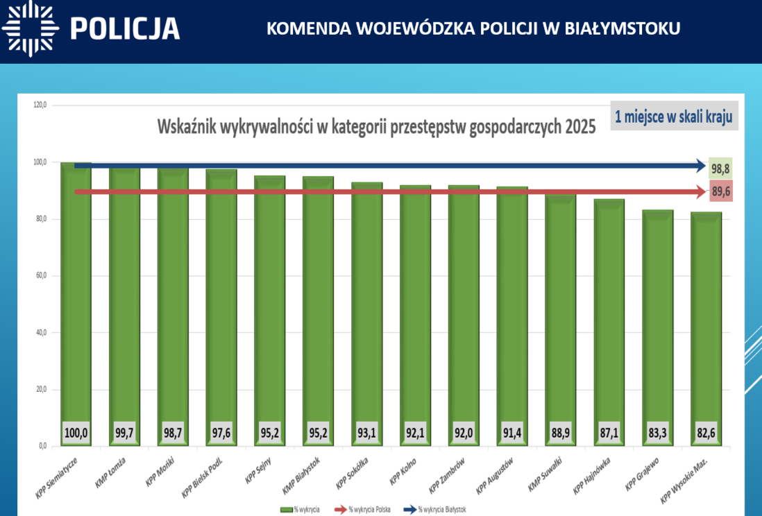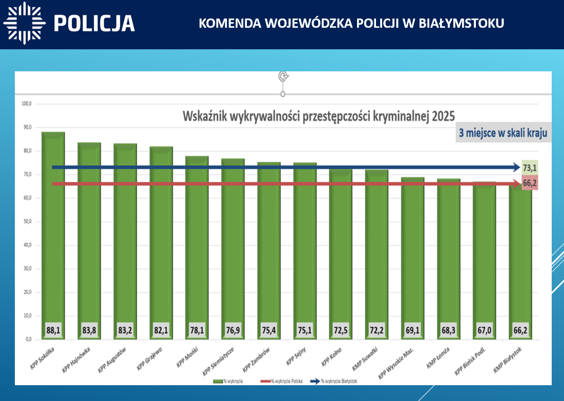 Podlascy śledczy mogą pochwalić się wysoką skutecznością wykrywania przestępczości kryminalnej i kształtuje się ona na poziomie 73,1%, co zapewniło nam 3 miejsce w kraju pod tym względem. Wzrósł wskaźnik wykrywalności przestępstw takich jak kradzież, który kształtuje się na poziomie 67,7%, co daje garnizonowi podlaskiemu 2 miejsce w Polsce. Wzrost także odnotowany został w wykrywalności kradzieży lub kradzieży z włamaniem samochodu. W 2025 roku wyniósł on 57,5%, co zapewniło 4 miejsce w kraju. Podium także zapewniła nam wykrywalność w przestępstwach gospodarczych i korupcyjnych. W 2025 roku wyniosła ona 98,8% (przestępstwa gospodarcze) i 100% (korupcyjne). Policjanci w 2025 roku zabezpieczyli od podejrzanych tytułem zabezpieczenia majątkowego blisko 31 milionów złotych i zatrzymali 198 kg narkotyków. W garnizonie podlaskim w ramach realizowanych czynności wykrywczych ustalono 8073 podejrzanych, tj. o 94 więcej niż w 2024 roku.