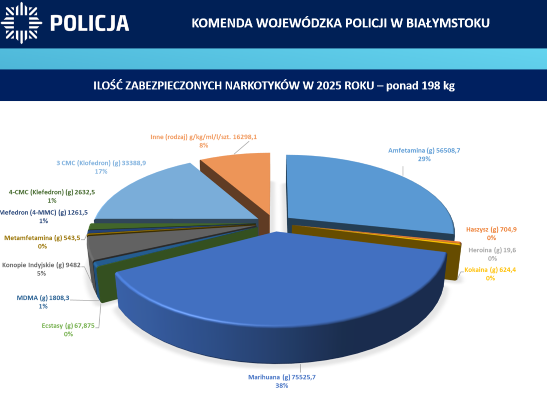 Podlaska Policja w 2025 roku realizowała projekty ze środków pochodzących z funduszy europejskich. Zostało zorganizowanych 7 takich projektów na łączną kwotę 14 004 547 zł i 3 618 551 euro, w tym m.in. "Partnerstwo w bezpieczeństwie- poprawa współdziałania instytucji publicznych w sytuacji kryzysowej"- projekt we współpracy z ABW, GROM, FORMOZA, BOA, CBŚP, CBZC; "Wzrost bezpieczeństwa w polsko - litewskim rejonie przygranicznym poprzez intensyfikację współpracy Policji"; "Współpraca służb kontrterrorystycznych Policji IN SERVICE++".