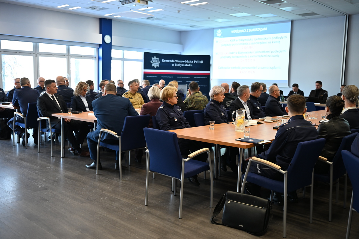 Przedstawienie stanu bezpieczeństwa w województwie, omówienie efektów pracy policjantów garnizonu podlaskiego za rok ubiegły oraz plany na najbliższe 12 miesięcy – to główne zagadnienia dzisiejszej odprawy. W spotkaniu uczestniczyli również Wojewoda Podlaski Jacek Brzozowski, I Wicewojewoda Podlaski Paweł Krutul, Dyrektor Biura Wojewody Mateusz Ziemblicki, Radny Województwa Podlaskiego Karol Pilecki, Prokurator Regionalny w Białymstoku Tadeusz Marek, Prokurator Okręgowy w Białymstoku Mirosław Józef Żoch, Prokurator Okręgowy w Suwałkach Aneta Górnicka-Piskorska, Prokurator Okręgowy w Łomży Tomasz Wilk, gen. bryg. SG Sławomir Klekotka – Komendant Podlaskiego Oddziału Straży Granicznej, st. bryg. Janusz Kondrat – Podlaski Komendant Wojewódzki Państwowej Straży Pożarnej, Tomasz Wyszkowski Podlaski Wojewódzki Inspektor Transportu Drogowego, mł. insp. Bartosz Orłowski – Naczelnik Zarządu w Białymstoku Centralnego Biura Śledczego Policji, kom. Paulina Kondrusiewicz – Naczelnik Wydziału w Białymstoku Biura Spraw Wewnętrznych Policji, mł. insp. Krzysztof Kropiwnicki – Naczelnik Wydziału Operacyjno -Śledczego I Zarządu w Białymstoku Centralnego Biura Zwalczania Cyberprzestępczości, Krzysztof Wierzbicki - Przewodniczący Zarządu Wojewódzkiego NSZZ Policjantów woj. podlaskiego, Edyta Łapińska - Przewodnicząca Organizacji Międzyzakładowej NSZZ „Solidarność” Policji województwa podlaskiego w Białymstoku, Małgorzata Bielemuk - Wiceprzewodnicząca Wojewódzkiego Zarządu Zakładowego NSZZ Policjantów woj. podlaskiego, zastępcy Komendanta Wojewódzkiego Policji w Białymstoku, a także komendanci podległych komend miejskich i powiatowych Policji, naczelnicy poszczególnych wydziałów, kierownicy zespołów oraz kapelani podlaskich policjantów. Komendant Wojewódzki Policji w Białymstoku nadinspektor Kamil Borkowski ocenił efektywność działań podlaskiej Policji w 2025 roku oraz przedstawił priorytety i zadania, jakie stoją przed formacją w nowym roku. Zastępcy Komendanta Wojewódzkiego Policji w Białymstoku przedstawili natomiast wyniki pracy poszczególnych pionów.