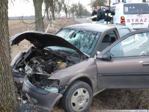 Kierowca opla wpadł w poślizg i zjechał do rowu. Tam uderzył w drzewo. Miał szczęście, że wystrzeliły poduszki. Policjanci z Wysokiego Mazowieckiego ustalają czy kierowca był trzeźwy.