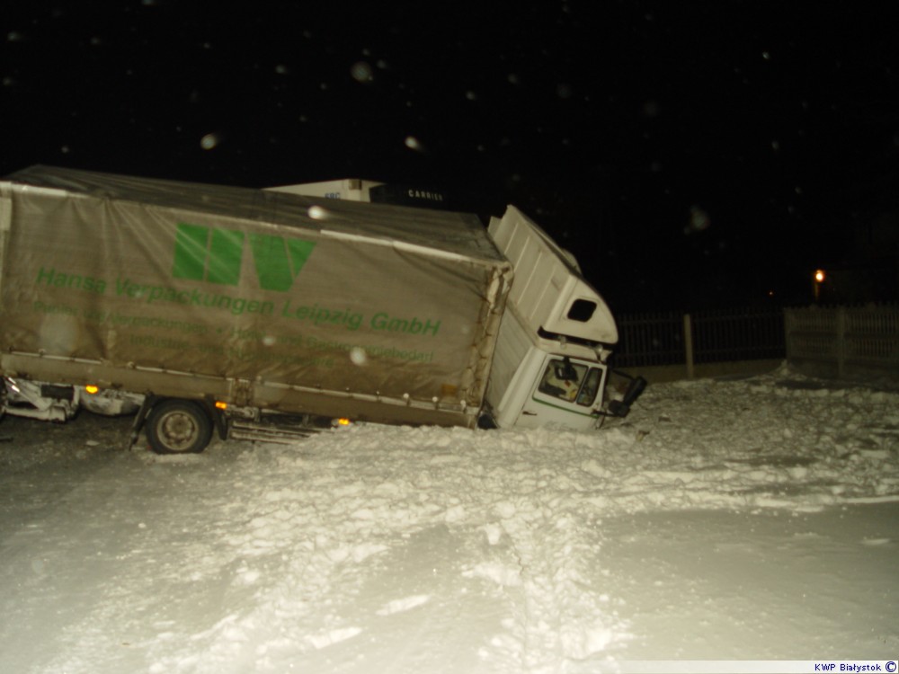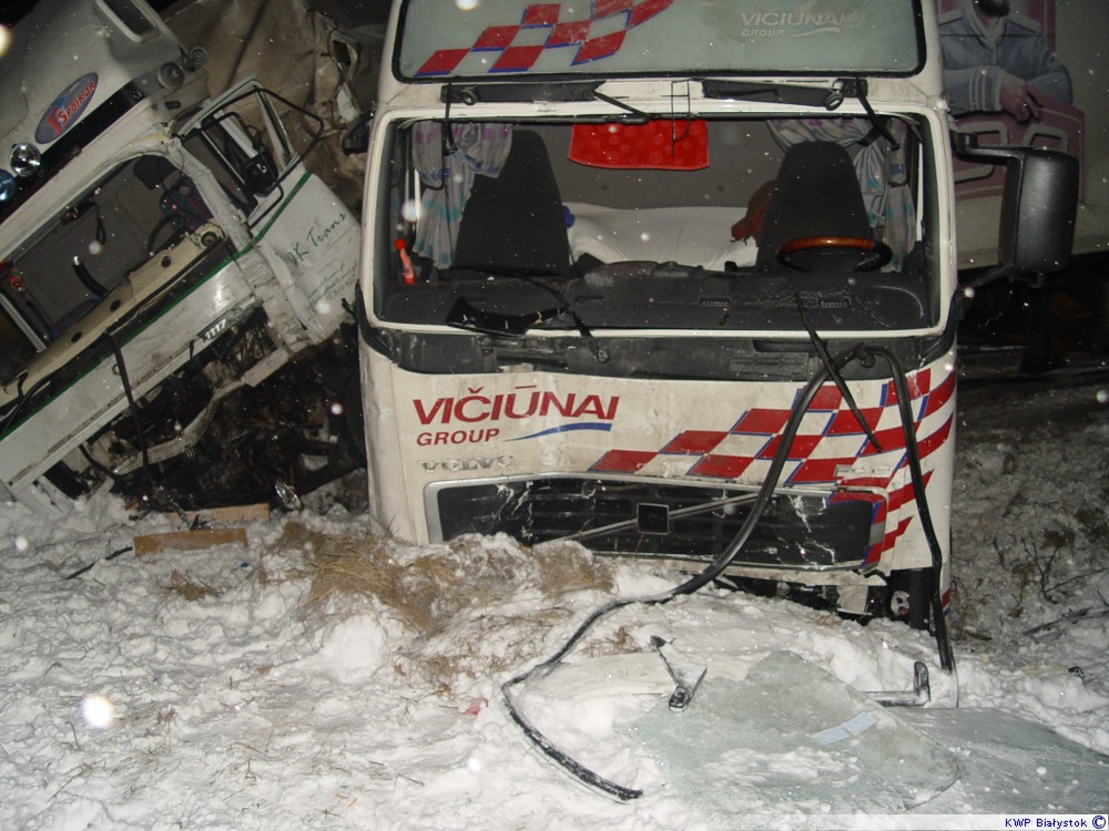 W piątek tuż przed godziną 16:00 w Zambrowie na krajowej „ósemce” doszło do tragicznego wypadku. 43-letni obywatel Litwy jadąc ciężarowym volvo w kierunku Białegostoku najprawdopodobniej nie dostosował prędkości do warunków panujących na drodze. W pewnym momencie zjechał na lewy pas ruchu i zderzył się czołowo z nadjeżdżającym z przeciwka ciężarowym mercedesem. W wyniku wypadku ranny został 50-letni kierowca mercedesa, który po przewiezieniu do szpitala zmarł. Drugi z kierowców nie doznał poważniejszych obrażeń. Droga nr 8 była w tym miejscu całkowicie zablokowana przez ponad 4 godziny, a utrudnienia w ruchu trwały do późnych godzin nocnych. Okoliczności zdarzenia wyjaśniają zambrowscy policjanci.